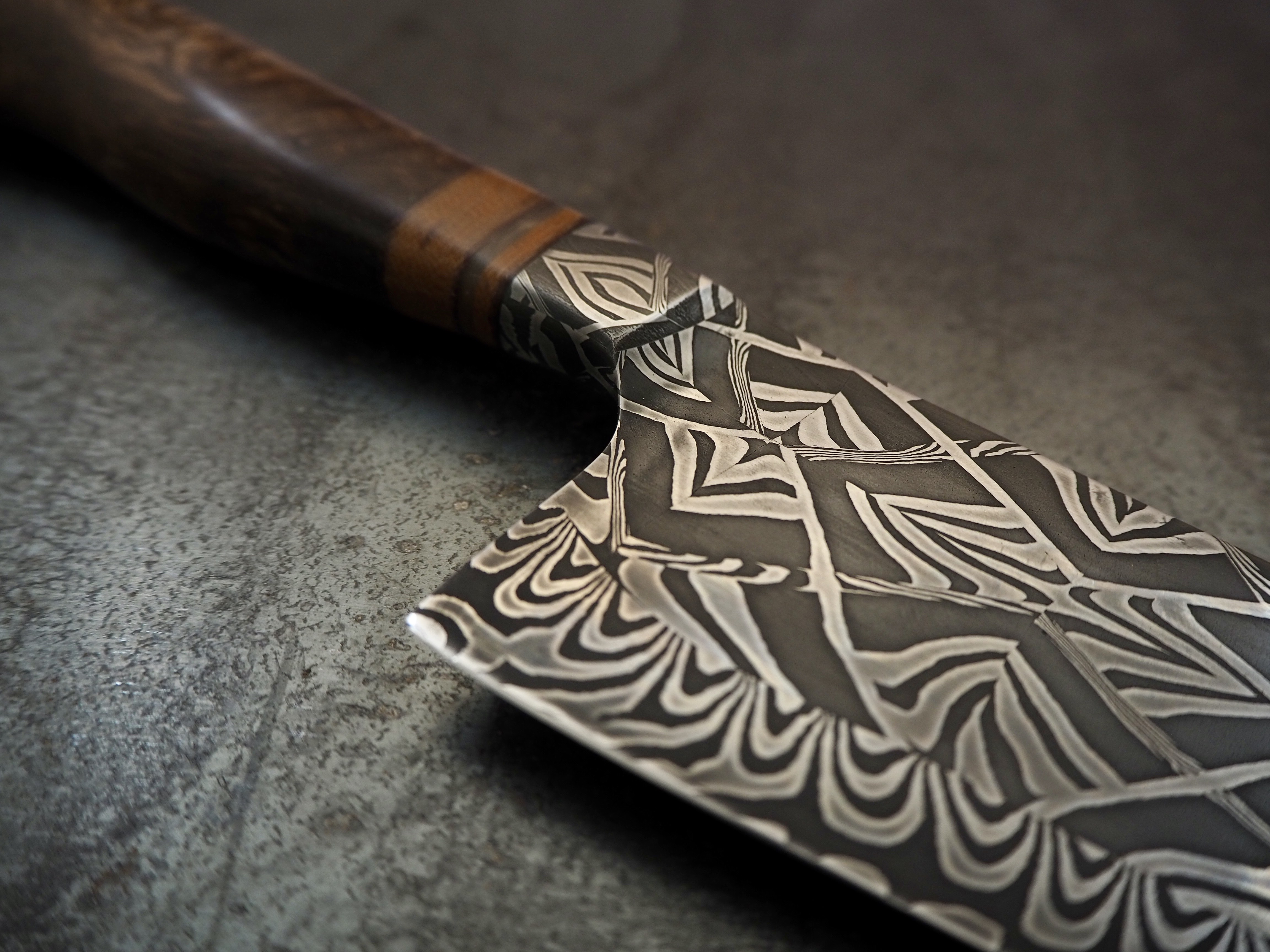 Recent work took inspiration from my time spent on a residential placement at The Center for Metal Arts in the USA; housed in one of the country's largest original steel mills. Living and working as an artist within such a rich industrial history I wanted to honor some of these work processes. I used complex forge welding techniques to create tessellated patterns within a bar of steel that I then tiled and fused in a mosaic pattern before forging the blade. Examples of pieces produced using this steel were exhibited last year as part of the Homo Faber Journey of Life exhibition in Venice, at the European Prize for Applied Arts in Brussels and a purchase by The National Museum of Ireland to be housed in their permanent collection.
